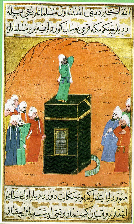 Традиция призыва на молитву (азан) возникла либо до переселения пророка Мухаммеда в Медину (хиджра), либо через два года после переселения. Ритуал азана введен по аналогии с колокольным звоном у христиан и звуком трубы у иудеев. Первым муэдзином был абиссинец Билял ибн Рабах, обладавший голосом необычайной силы, который был слышен по всей Медине[5]. Эту обязанность возложил на него пророк Мухаммад. Помимо него, одним из первых муэдзинов был и Абдуллах ибн Умм Мактум[6].