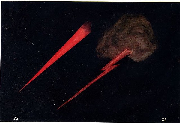 Рис. 22 и 23 — мыслеформы «убийственного бешенства» (правая) и «нескончаемой ненависти» (левая). Изображение справа «было взято из ауры полупьяного субъекта из лондонского Ист-Энда, когда он сбивал с ног женщину; вспышка сверкнула в её сторону, вызвав взрыв ужаса — она поняла, что её ударят. На той же иллюстрации нарисован направленный в левый нижний угол «стилетообразный дротик» — это мыслеформа постоянной злобы, сильного желания отомстить, вынашиваемого годами и направленного на человека, который нанёс тяжёлое увечье создателю её.[K 36][K 37]
