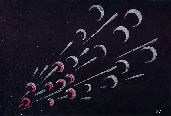 Авторы утверждают, что когда человек внезапно испуган, наблюдается эффект, изображённый на рис. 27. Подчёркивается, что все «полумесяцы» с правой стороны, очевидно «выпущенные» ранее других, не демонстрируют ничего, кроме «сизо-серого цвета страха», но чуть позднее создатель мыслеформы уже частично оправился от шока и начинает злиться, потому что позволил себе испугаться, — последующие «полумесяцы» частично окрашены багряным, что свидетельствует о «смеси гнева и страха», тогда как последний полумесяц чисто багряный — страх уже полностью преодолён и осталось только раздражение.[K 39]