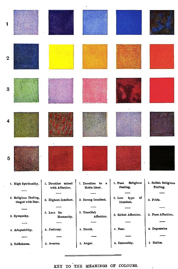 В мыслеформе слева на рис. 34, как объясняют авторы, нет ничего, кроме «самых высоких и прекрасных чувств». В основании можно заметить выражение глубокого сочувствия, «светло-зелёный показывает понимание страданий» родственников умершего и соболезнование им, а «полоса более глубокого зелёного» показывает отношение к самому умершему. «Глубокий розовый показывает любовь» и к умершему, и к окружающим, в то время как верхняя часть, состоящая из конуса и звёзд над ним, свидетельствует о чувстве в связи с мыслями о смерти: «голубой выражает её религиозный аспект», в то время как «фиолетовый свидетельствует о благородном идеале» и способности ему соответствовать, звёзды же отражают «духовные устремления».[K 47] На том же рисунке мыслеформа справа не отражает «ничего, кроме глубокой депрессии, страха и эгоизма... Такие эмоции, как отчаяние и чувство личной утраты, проявились в виде полос коричнево-серого и свинцово-серого цвета», в то время как нижнее ответвление выражает сильное эгоистичное желание «поднять» умершего из могилы.[K 48][K 49]