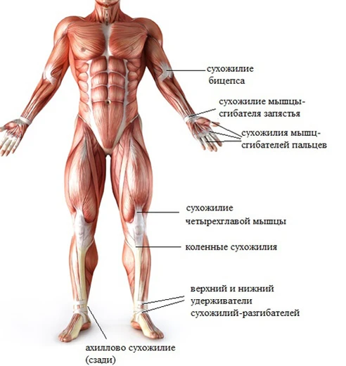 К основным мышцам человека относят: мышцы шеи, дельтовидную, трапецевидную, большую грудную, портняжную, большую седалищную, переднюю большеберцовую, икроножную мышцы, двуглавую и трёхглавую мышцу плеча, косые и прямые мышцы живота, широчайшую мышцу спины, двухглавую и четырёхглавую мышцу бедра, а также разгибатели запястья и пальцев, сухожилия, связки и ахиллово сухожилие.