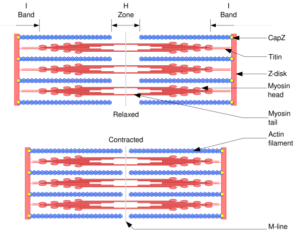 | Титин | Большой гибкий белок, образующий цепь для связывания миозина с Z-диском. | ||