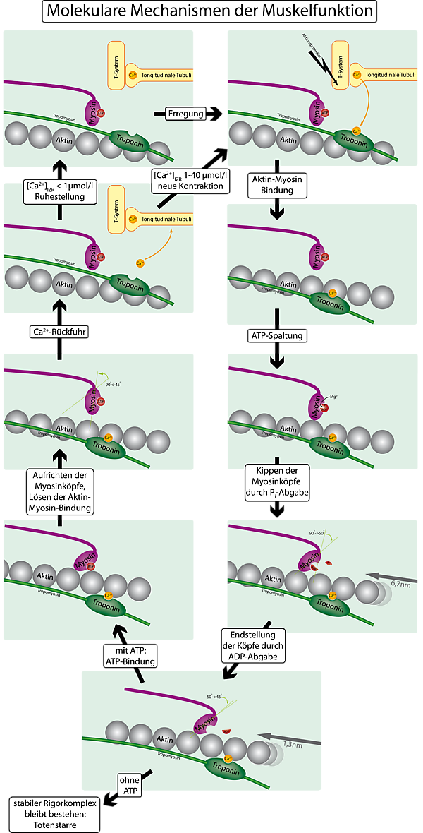 Для того, чтобы контролировать сокращение, к актиновому филаменту прикрепляется белок тропомиозин и комплекс из трёх белков — тропонин (субъединицы этого комплекса называются тропонинами T,I и C). Тропонин C — близкий гомолог другого белка, кальмодулина. Через каждые семь субъединиц актина расположен только один тропониновый комплекс. Связь актина с тропонином I перемещает тропомиозин в положение, мешающее связи миозина с актином. Тропонин C связывается с четырьмя ионами Ca2+ и ослабляет действие тропонина I на актин, и тропомиозин занимает положение, не препятствующее связи актина с миозином. Источником энергии для сокращения мышечных волокон служит АТФ. При связывании тропонина с ионами кальция активируются каталитические центры для расщепления АТФ на головках миозина. За счет ферментативной активности головок миозина гидролизуется АТФ, расположенный на головке миозина, что обеспечивает энергией изменение конформации головок и скольжение нитей. Освобождающиеся при гидролизе АТФ молекула АДФ и неорганический фосфат используются для последующего ресинтеза АТФ. К миозиновой головке присоединяется новая молекула АТФ. При этом происходит разъединение поперечного мостика с нитью актина. Повторное прикрепление и отсоединение мостиков продолжается до тех пор, пока концентрация кальция внутри миофибрилл не снизится до подпороговой величины. Тогда мышечные волокна начинают расслабляться.
