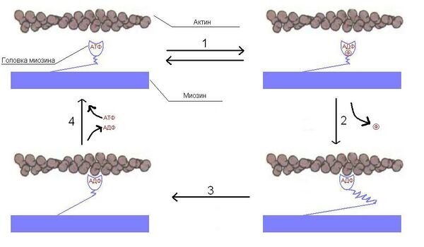 Головки миозина расщепляют АТФ и за счет высвобождающейся энергии меняют конформацию, скользя по актиновым филаментам. Цикл можно разделить на 4 стадии: