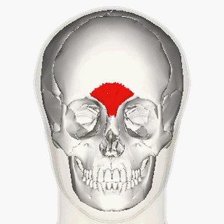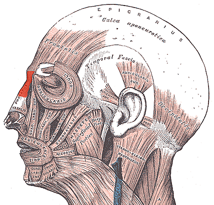 Опуская кожу данной области книзу, вызывает образование поперечных складок над переносьем[3].