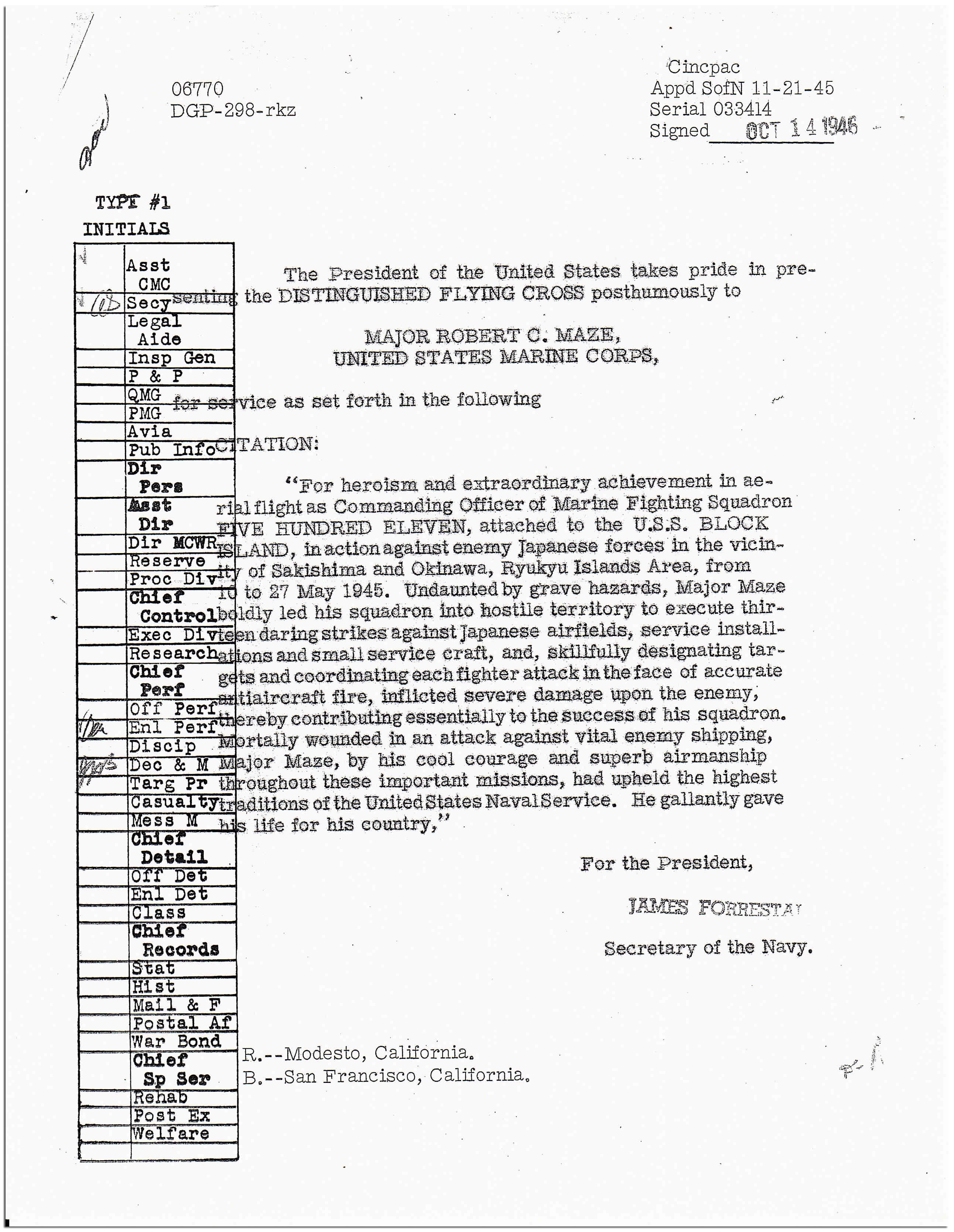 For heroism and extraordinary achievement in aerial flight as Commanding Officer of Marine Fighting Squadron FIVE HUNDRED ELEVEN, attached to the U.S.S. Block Island, in action against enemy japanese forces in the vicinity of Sakishima and Okinawa, Ryukyu Islands Area, from 16 to 27 may 1945. Undaunted by grave hazards, Major Maze boldly led his squadron into hostile territory to execute thirteen daring strikes against Japanese airfields, service installations and small service craft, and, skillfully designating targets and coordinating each fighter attack in the face of accurate antiaircraft fire, inflicted severe damage upon the enemy, thereby contributing essentially to the success of his squadron. Mortally wounded in an attack against vital enemy shipping, Major Maze, by his cool courage and superb airmanship throughout these important missions, had upheld the highest traditions of the United States Naval Service. He gallantly gave his life for his country.