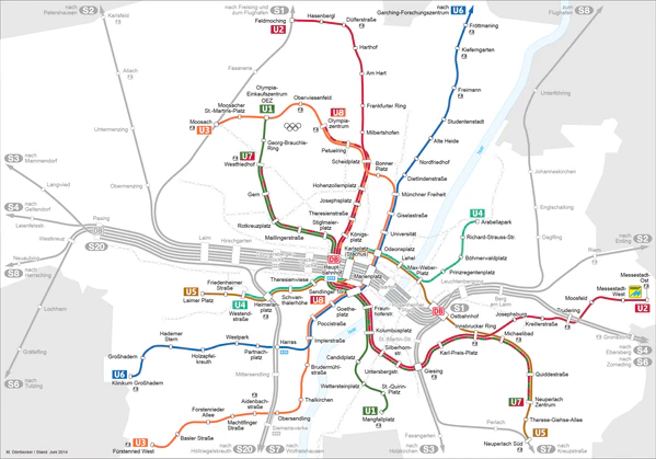 Мюнхенский метрополитен (нем. U-Bahn München) насчитывает 6 линий, общая длина сети составляет 103,1 км. На линиях расположены 100 станций. Для обслуживания используются 576 поезда типов A, B и C[2]. Ускорение и торможение поездов происходит под управлением компьютера, расписание соблюдается в 98 % случаев (по данным MVG).