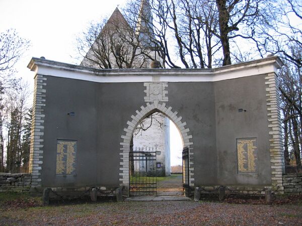 - ограда церковного сада с воротами-монументом[17]. В 1932 году в восточной части церковного сада были установлены ворота, одновременно ставшие памятником погибшим в Освободительной войне. В годы советской власти ворота были переделаны, в 1989 году им вернули прежний вид[10];