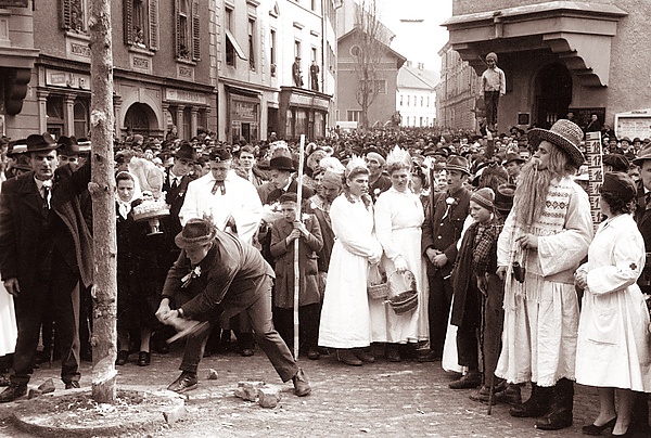 У словенцев Прекмурья известен обряд, исполняемый в Мясопуст[51], — «свадьба с сосной» (словен. borovo gostüvanje, ženitev z borom, gostüvanje z borom). Обряд близок восточно- и западнославянской колодке как способ побудить холостую молодёжь свадебного возраста вступить в брак[52]. Если в прошедшем году не было ни одной свадьбы, то в последнее воскресенье перед Великим постом на деревенской площади сходились все жители, кто-то рядился в свадебных персонажей — «сватов», «дружков» и других персонажей, и разыгрывалась символическая свадьба. В роли «невесты» выступала сосна, которую выбирали заранее. «Сосну-невесту» называли smreka, а «сосну-жениха» — bor. В лесу ряженый «поп» венчал неженатого парня с сосной. Где-то сосну заменяла девушка. После венчания «дружки» украшали дерево венками и лентами как невесту, клали её на телегу, на бревно под свадебные песни сажали «жениха» (или «невесту»), затем селяне впрягались в тележку и волокли её в село[53].