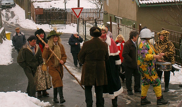 Состав ряженых довольно разнообразный. Из зооморфных образов чаще всего переодевались в медведя, который считался символом плодовитости, а также наряжались конём и козой. Из антропоморфных персонажей переодевались в бабу с ношей, женщину с младенцем, в которые обычно рядились мужчины, а также в трубочиста, лесника, врача, жандарма, цыгана, турка, еврея, шута и «смертушку»[42]. В чешском регионе Словацко (юго-восток) мясопуст назывался Фашанк (чеш. fašank). Главными действующими лицами были холостые парни «подшабляры», которые ходили по дворам, где жили девушки на выданье, и танцевали с ними древний танец с саблями (чеш. pod šable)[41].
