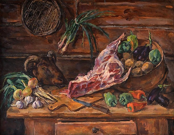 На полотне изображён натюрморт, составленный из лежащих на столе и в решете овощей — чеснок, лук, перец, баклажан, картофель. В центре композиции размещено мясо, а слева выделяется баранья голова. На разделочной доске расположен нож. Фоном служит деревянная стена, на которой висят решето и пучок зелёного лука.