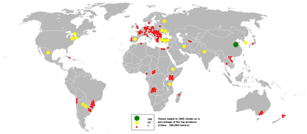 Четвёрка ведущих производителей мёда за 2013 год (по данным Продовольственной и сельскохозяйственной организации ООН (FAO)): на первом месте КНР, на втором — Турция, на третьем — Аргентина, на четвёртом — Украина[48]. По данным Всемирной Ассоциации пчеловодческих организаций, на первом месте находится КНР, на втором — США, на третьем — Аргентина, на четвёртом — Турция, на пятом — Украина, на шестом — Мексика, на седьмом — Россия[49].