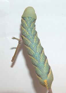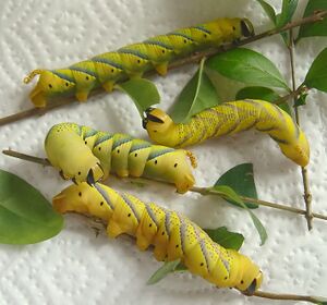 Встречаются формы с различной окраской: жёлто-голубой, зелёной и бурой. Чаще всего встречается лимонно-жёлтая с синими косыми полосами, сходящимися на спине под острым углом; тело, начиная с 4 и по 11 сегмент, усеяно чёрно-синими точками. Рог изогнут в виде буквы «S», зернистый и шершавый. Также встречаются гусеницы с зелёной окраской и с зелёными полосами, а также серо-бурые с белым рисунком. Последний вид окраски не считается нормальным, что доказывается не только большой редкостью таких экземпляров в Европе, но и тем обстоятельством, что в молодом возрасте, а также после линьки, временно бывают зелёной окраски. Продолжительность стадии гусениц составляет около 8 недель[1].