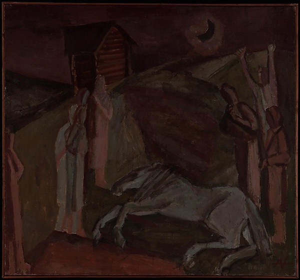 В центре композиции изображена лежащая лошадь, вокруг которой собрались скорбящие люди. На заднем плане, среди холмов, виднеется деревянная изба. Небо выполнено в темно-коричневых оттенках с чёрной луной, что придаёт сцене мистическую атмосферу, характерную для фантастической живописи. Общая цветовая гамма построена на сочетании коричневых, зелёных и серых тонов, что подчёркивает тревожное и мрачное настроение работы.