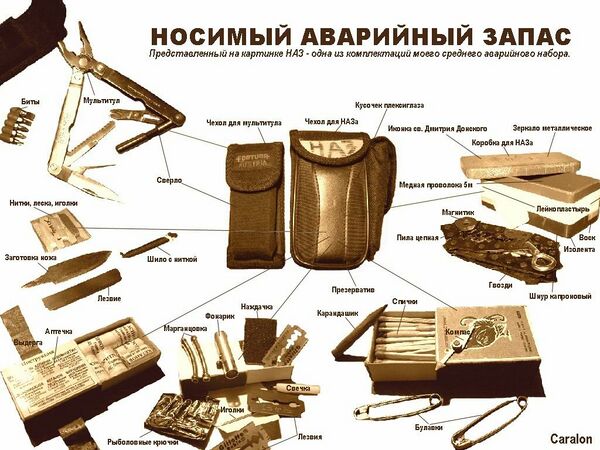 Как правило, это отдельно упакованный минимально необходимый набор инструментов, материалов, продуктов питания, лекарств и прочего. Человек носит его для того, чтобы при наступлении аварийной ситуации обеспечить своё выживание и безопасность «вдали от цивилизации» в течение времени, достаточного для организации спасения. Так, НАЗ входит в оснащение лётчиков и космонавтов, в состав комплектации морских спасательных средств.