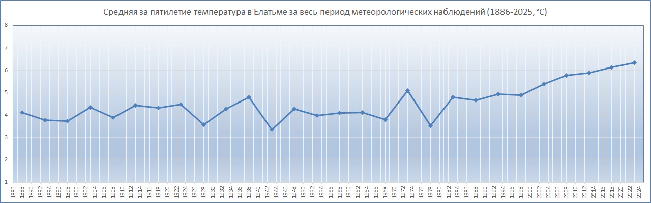 Согласно наблюдениям метеостанции, последняя четверть XX века в Елатьме выдалась более тёплой в сравнении с тремя предыдущими, а в XXI веке тенденция к потеплению сохранена. С начала 1980-х годов отмечается устойчивый рост среднегодовой температуры — до этого её изменение не было явно выраженным, но можно отметить, что второе и третье 25-летия были прохладнее первого и четвёртого. После некоторого снижения среднегодовой нормы осадков в 1926—1950-е годы в последующие 25-летия наблюдается её рост.