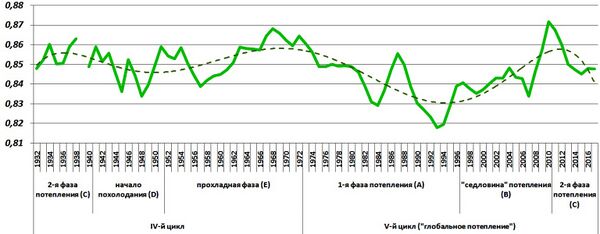 Согласно полученному на метеообсерватории Хадли в Средней Англии (Центр климатических прогнозов и исследований Хэдли) сверхдлинному непрерывному ряду наблюдений за погодой длительностью свыше 360 лет, реальная климатическая динамика предстаёт в форме циклических колебаний (на данный момент выделено пять циклов продолжительностью 70 ± 10 лет) при устойчивой, но слабой общей тенденции к потеплению, обусловленной цикличностью более высокого порядка — повышательной фазой ритма Петерсона — Шнитникова. В полученном на метеостанции Елатьма многолетнем ряде среднегодовых температур вполне отчётливо прослеживаются все фазы климатических циклов IV и V при почти полной синхронности с данными обсерватории Хадли[7].