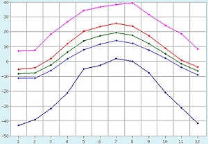 | 2005 год | −4,5 | −10,3 | −7,6 | 6,2 | 16,2 | 16,3 | 18,7 | 17,5 | 12,9 | 5,6 | 0,7 | −5,3 | 5,5 | +0,1 |