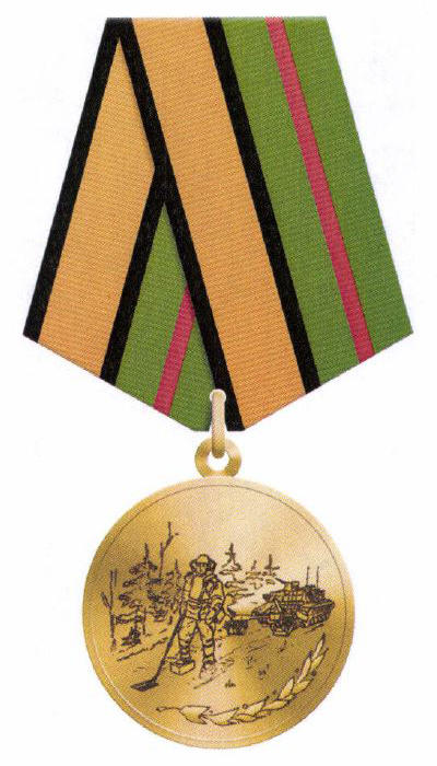 | Медаль «За разминирование»[13][14] | 26 февраля 2002 | Обновлена приказом от 14.12.2017 № 777 | |