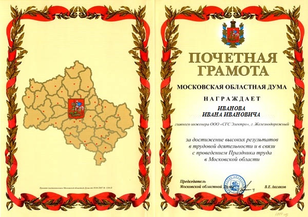 Почётная грамота Московской областной Думы |
