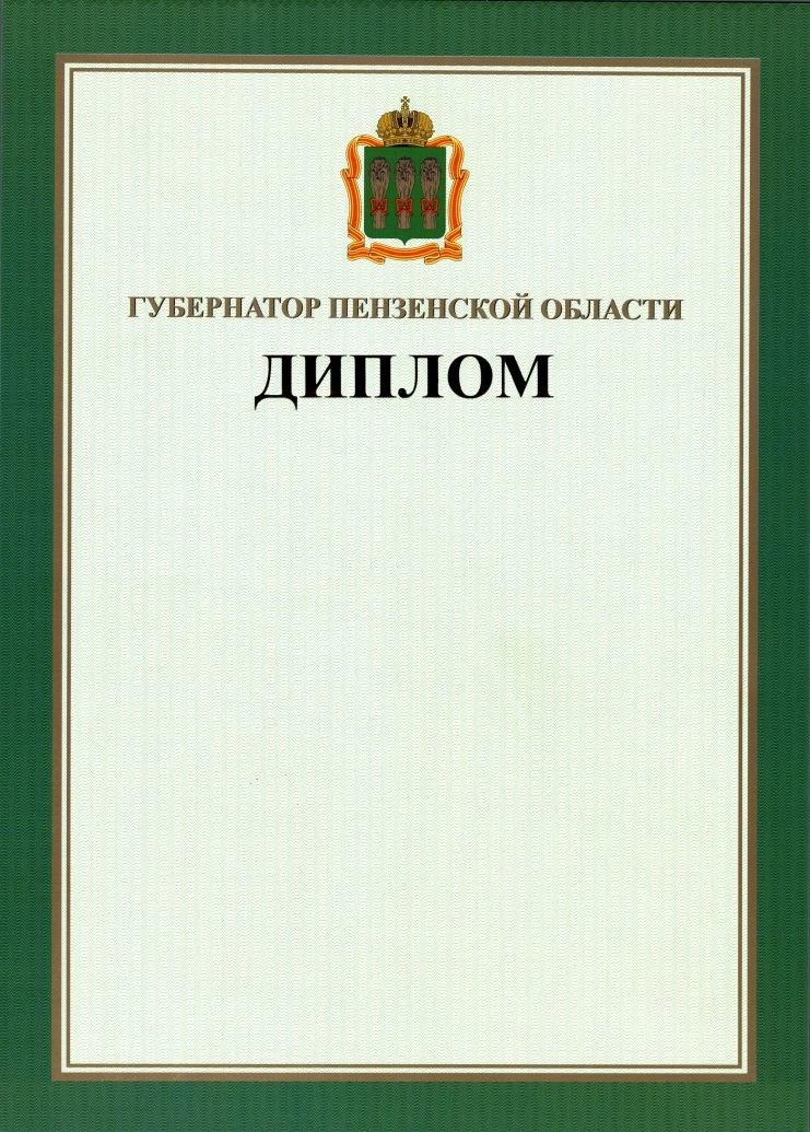 Диплом Губернатора Пензенской области является формой поощрения за достижение наивысших показателей на конкурсах, соревнованиях, смотрах, олимпиадах, фестивалях и иных конкурсных мероприятиях (далее - конкурсные мероприятия), проводимых в соответствии с постановлениями, распоряжениями Губернатора, Правительства Пензенской области. Дипломом Губернатора награждаются победители (лауреаты, призёры) конкурсных мероприятий в случаях, если награждение Дипломом предусмотрено постановлением, распоряжением Губернатора, Правительства Пензенской области о соответствующем конкурсном мероприятии или положением о нём. Допускается повторное награждение Дипломом за новые достижения. |