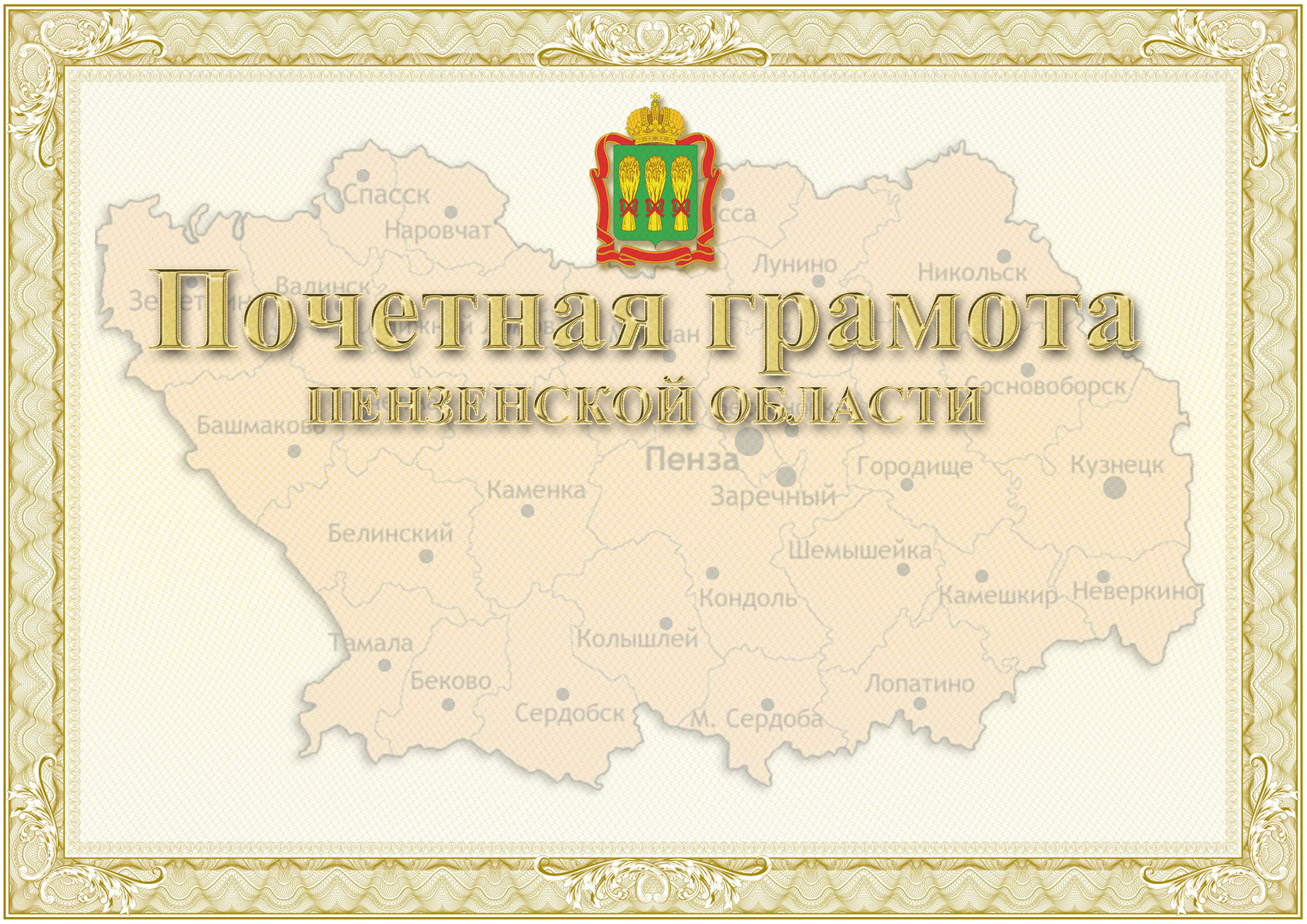 Награждение Почётной грамотой Пензенской области является формой поощрения граждан и коллективов организаций независимо от форм собственности за заслуги в экономике, строительстве, науке, культуре, искусстве, воспитании, просвещении, спорте, обеспечении безопасности, укреплении законности, охране здоровья и жизни, защите прав и свобод граждан, благотворительной деятельности и иные заслуги перед Пензенской областью. Граждане представляются к награждению Почётной грамотой Пензенской области при наличии у них Почётной грамоты Губернатора Пензенской области либо Почётной грамоты Законодательного Собрания Пензенской области, с момента награждения которой прошло не менее одного года. Награждённому одновременно с вручением Почётной грамоты Пензенской области вручается нагрудный знак к Почётной грамоте Пензенской области и Устав Пензенской области. |