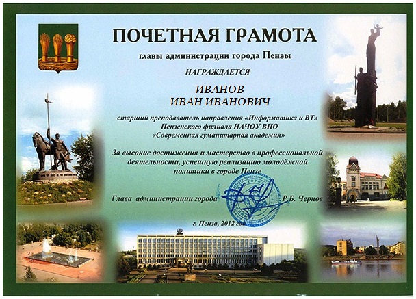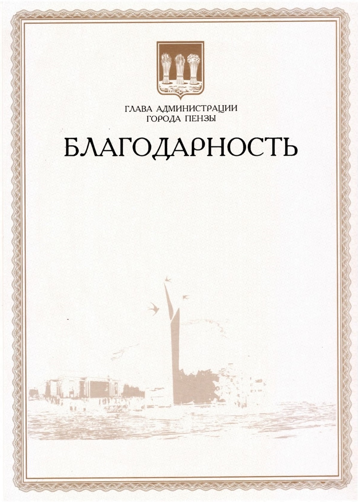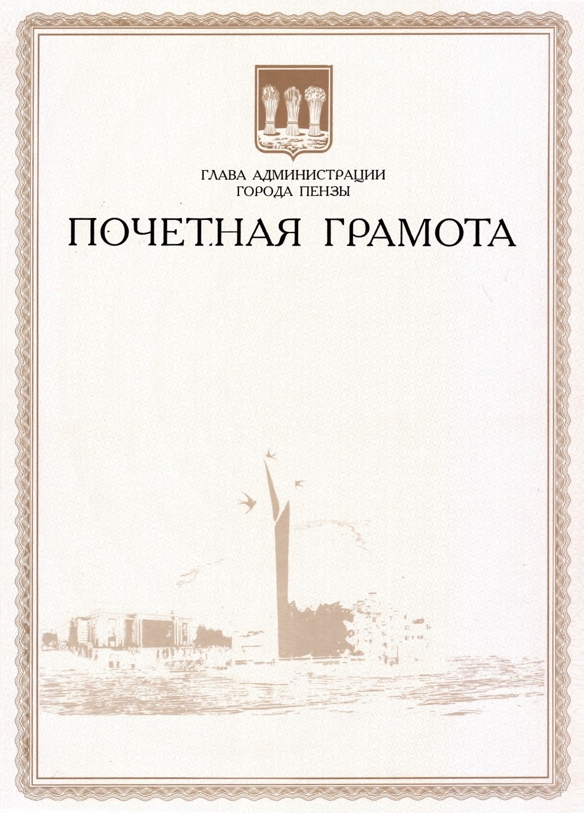 Почётная грамота главы администрации города Пензы является поощрением за заслуги в формировании и реализации социальной и экономической политики города, обеспечении законности, прав и свобод граждан, эффективной работе органов местного самоуправления, за многолетний добросовестный труд, высокие достижения и мастерство в профессиональной деятельности. Почётной грамотой награждаются, как правило, государственные и муниципальные служащие и другие граждане, а также коллективы предприятий, организаций и учреждений, своим трудом внесшие большой вклад а развитие одной из сфер деятельности. Награждением Почётной грамотой могут быть удостоены граждане других субъектов Российской Федерации и иностранных государств за существенный вклад в развитие и укрепление межрегиональных и международных связей, взаимовыгодного сотрудничества. |