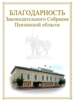 Благодарность Законодательного Собрания Пензенской области (далее - Благодарность) объявляется гражданам и организациям, как правило, к юбилейным датам, за активное участие в законотворческой деятельности, общественной жизни, обеспечении прав и свобод граждан, укреплении государственной власти и местного самоуправления, весомый вклад в социально-экономическое развитие Пензенской области. Решение об объявлении благодарности оформляется распоряжением Председателя Законодательного Собрания. Лица и организации, которым объявлена благодарность, могут вновь представляться к объявлению благодарности, как правило, не ранее чем через один год после предыдущего объявления. |