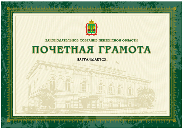 Почётной грамотой Законодательного Собрания Пензенской области (далее - Почётная грамота) награждаются граждане и организации, как правило, к юбилейным датам, за активное участие в законотворческой деятельности, общественной жизни, обеспечении прав и свобод граждан, укреплении государственной власти и местного самоуправления, весомый вклад в социально-экономическое развитие Пензенской области. В соответствии с распоряжением Председателя Законодательного Собрания награждённому гражданину вручается лацканный знак в виде стилизованного герба Пензенской области и ценный подарок (памятный сувенир) стоимостью не более трёх тысяч рублей. Лица и организации, награждённые Почётной грамотой, могут вновь представляться к награждению Почётной грамотой, как правило, не ранее чем через три года после предыдущего награждения. |