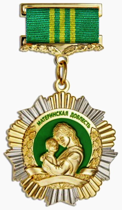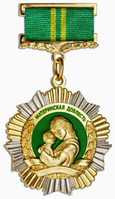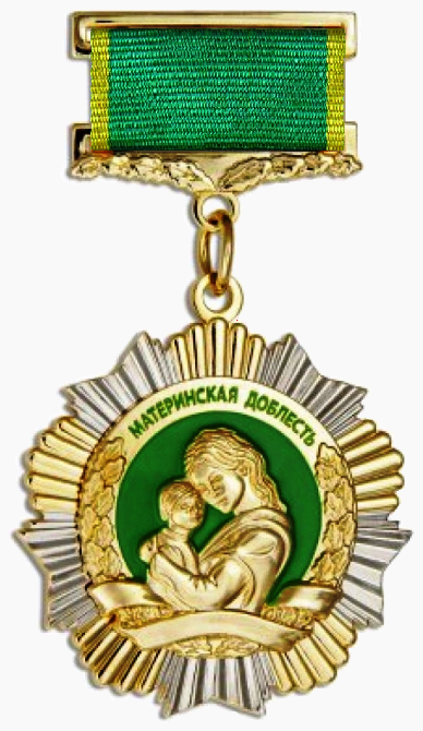 Медаль «Материнская доблесть» (далее - Медаль) является формой поощрения женщин за рождение (усыновление) и достойное воспитание трёх и более детей. Медалью награждаются женщины, родившие (усыновившие) и воспитавшие трёх и более детей. Награждение производится по достижении последним ребёнком возраста одного года. Учитываются также дети, погибшие и пропавшие без вести при защите Отечества или при исполнении иных обязанностей военной службы либо при выполнении долга гражданина по охране законности и правопорядка, а также умершие вследствие ранения, контузии, увечья или заболевания, полученных при указанных обстоятельствах, либо вследствие техногенных и экологических катастроф, стихийных бедствий, либо вследствие трудового увечья, профессионального заболевания, наступления несчастного случая, повлекшего смерть, в процессе учёбы, спортивных тренировок, соревнований. Вместе с медалью вручается удостоверение о награде. --- Медаль «Материнская доблесть» I степени вручается за рождение и (или) усыновление и воспитание девяти детей. |