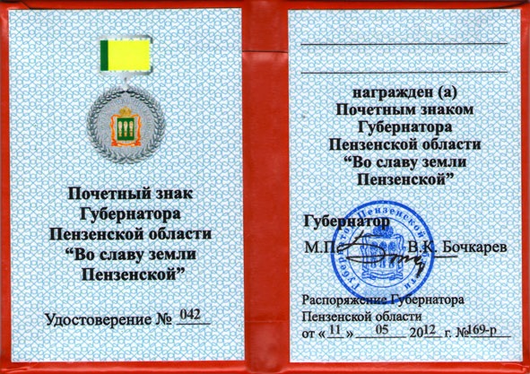 Благодарность Губернатора Пензенской области является формой поощрения за заслуги в социально-экономическом и культурном развитии Пензенской области, повышении эффективности деятельности органов государственной власти и органов местного самоуправления Пензенской области, осуществлении мер по обеспечению законности, прав и свобод граждан, за иные заслуги. Благодарность Губернатора Пензенской области может объявляться гражданам Российской Федерации и коллективам предприятий, организаций, учреждений, независимо от форм собственности, как правило, к юбилейным датам. Граждане и коллективы предприятий, организаций, учреждений, которым объявлена благодарность Губернатора Пензенской области, не ранее чем через год, могут за новые заслуги представляться к награждению Почётной грамотой Губернатора Пензенской области. |