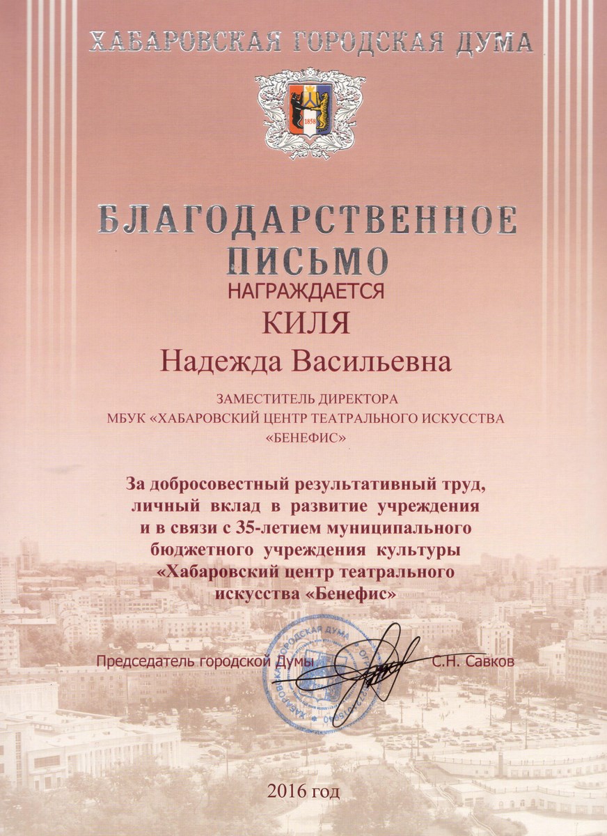 Благодарственное письмо Хабаровской городской Думы[4] |