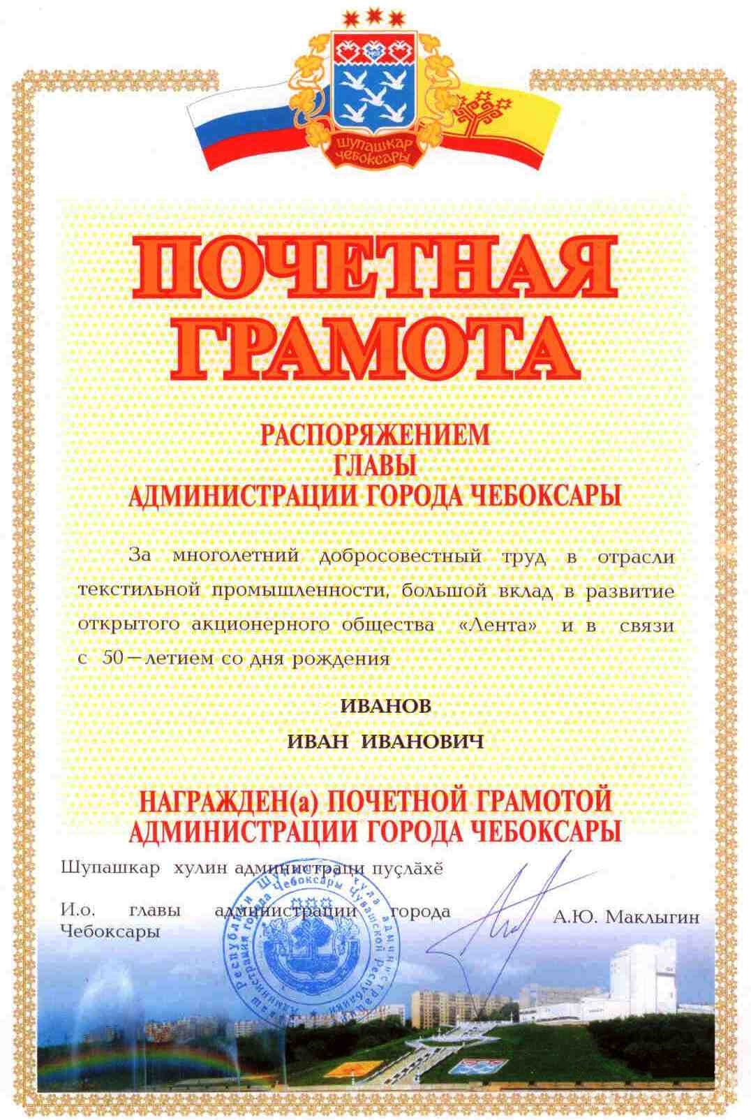 Награждение Почётной грамотой администрации города Чебоксары производится за особый личный вклад в социальное, экономическое, культурное развитие города Чебоксары, является одним из важнейших моральных стимулов и призвано способствовать повышению трудовой и общественной активности граждан. Почётной грамотой награждаются граждане Чувашской Республики, субъектов Российской Федерации, других государств своим трудом заслужившие широкую известность благодаря личному вкладу в развитие города. Почётной грамотой также могут быть награждены предприятия, учреждения, организации, общественные объединения и районы города Чебоксары. Представление к награждению Почётной грамотой производится не ранее, чем через 3 года после поощрения Почётной грамотой администрации района города Чебоксары. Отдел делопроизводства администрации города ведёт учёт награждённых Почётной грамотой. |