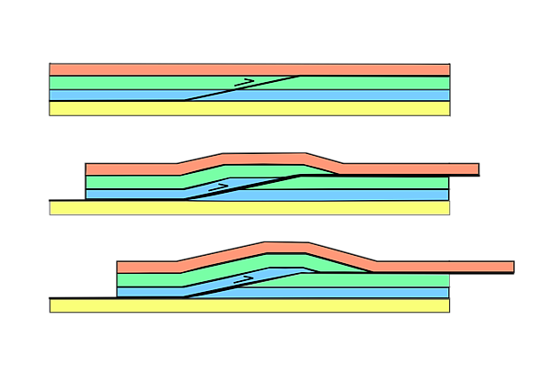 - надвиг скалывания — сформировавшийся независимо от складчатости. Может пересекать и горизонтальные, и смятые в складки пласты.