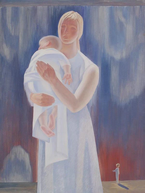 В центре композиции изображена молодая женщина, стоящая поколенно и одетая в светлое лёгкое платье. Она держит на руках светловолосого младенца, закутанного в белую пелёнку и прижавшегося к её правому плечу. Фигура женщины слегка повернута влево, её лицо выражает задумчивость. В правой нижней части картины находится стоящий в профиль ребёнок в белой одежде. Фон выполнен в виде всполохов серо-голубого и мягко-красного цвета, что придаёт работе особую цветовую гамму.