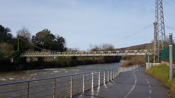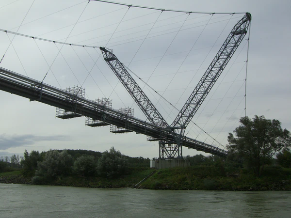 Висячие трубопроводы надземных переходов трубопроводов, в которых трубы подвешиваются к несущим элементам — тросам (канатам), вантам, цепям и т. п., сооружаются при пересечении протяжённых преград (ущелье, водные объекты и другие) шириной более 50-60 м, однако, известны висячие трубопроводы c пролётами длиной 200—400 м и более[5]. Так, например, построен крупнейший висячий мост через Амударью в 1964 году в Евразии[6] с возможностью пропуска автомобильной нагрузки под две нитки газопровода через реку Амударью (длина основного пролёта 390 м), соединяющий Хорезмскую область Узбекистана и Лебапский велаят (бывшую Чарджоускую область) Туркмении.