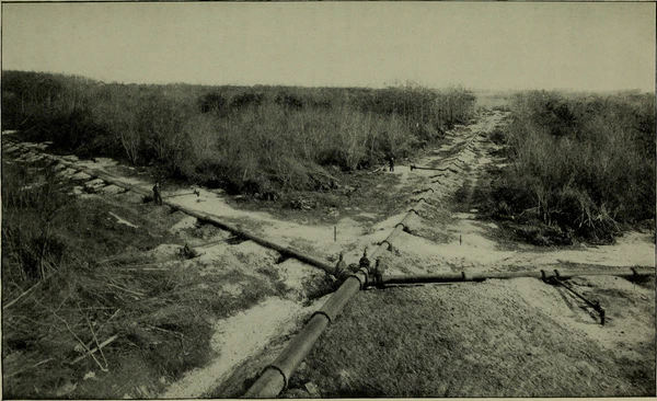 Трубопроводы подвешивали к деревянным треугольным опорам на высоте 1 м от земли. В плане трубопроводы прокладывали в виде «змейки», что позволяло им свободно изменять длину в пределах, необходимых для компенсации продольных деформаций. В местах перелома угол принимали 23°. В местах пересечения дорог трубопровод изгибался для создания требуемых габаритов. Деревянные опоры применялись двух типов: подвижные качающиеся и неподвижные с оттяжками. Последние устанавливали посредине каждого прямолинейного участка. В качестве противокоррозийной изоляции применяли обмазку трубопровода цементным молоком.