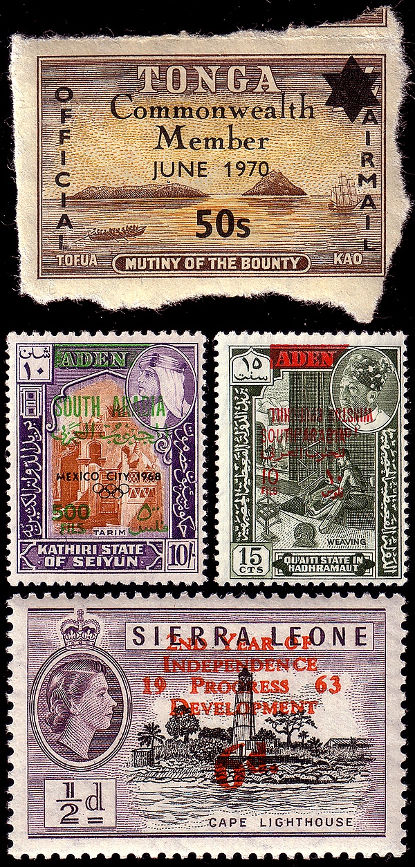 Например, после деколонизации Южного Йемена в 1967 году на марках различных эмиратов протектората Аден британских времён были сделаны одновременно 16 надпечаток в различных сочетаниях: «Южная Аравия», изменённые номиналы в новой валюте, пять олимпийских колец к Олимпиаде в Мехико и остальным Олимпийским играм, начиная с берлинских, а также имя Уинстона Черчилля в нормальном и перевёрнутом виде, с годами его жизни и без.