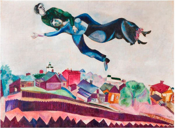 Художник позволил себе маленькое хулиганство: у домов пасётся зелёная коза, а в левом нижнем углу картины под забором мужик со спущенными штанами справляет нужду. Шагал словно подчёркивает, что в самой бытовой обыденности влюблённые могут воспарить над реальностью. Картина в буквальном смысле воплощает метафору «летать от счастья»[6].