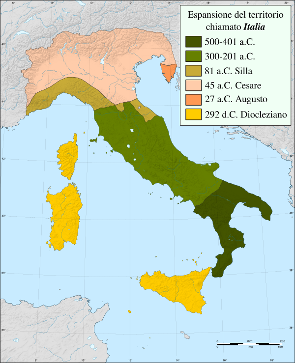 Греки, создавшие на юге Апеннинского полуострова Великую Грецию, способствовали распространению названия «Италия» применительно к более крупному региону. После того как Великая Греция к III–II векам до н. э. была поглощена Римской республикой, территориальная экспансия названия продолжилась[7] на центральную и северную части Апеннинского полуострова. В 49 году до н. э. Гай Юлий Цезарь дал римское гражданство населению провинции Цизальпийская Галлия[8], а между 43 и 42 годами до н. э. консулом Октавианом Августом эта провинция была объединена с Италией, тем самым границы Италии продвинулись на север до южного подножия Альп[9][10].