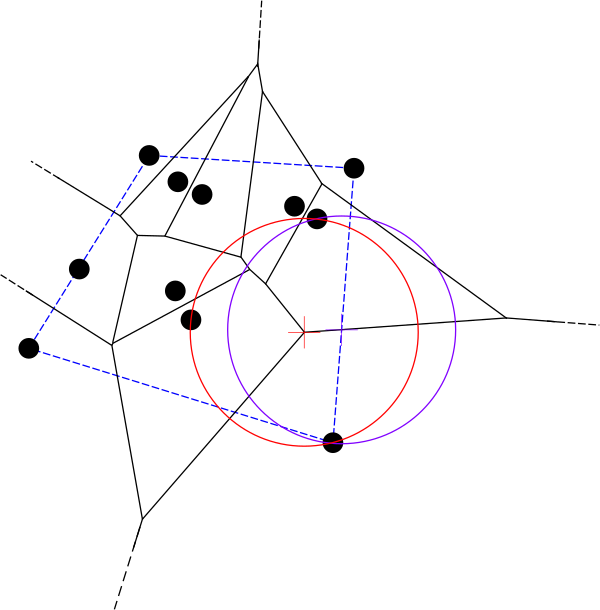 Общий частный случай следующий. Пусть задано n точек на плоскости, найти наибольшую окружность, находящуюся в выпуклой оболочкеll этих точек и не включающую ни одной из этих точек. Задачу можно решить с помощью диаграмм Вороного за оптимальное время [1][2].