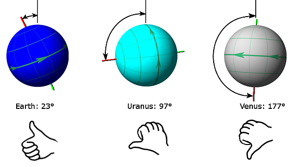 Второй метод использует правило буравчика (правило правой руки) для определения положительного полюса, принимаемого за точку отсчета[2]. В этом случае Венера наклонена на 177° (расположена «вверх ногами»).