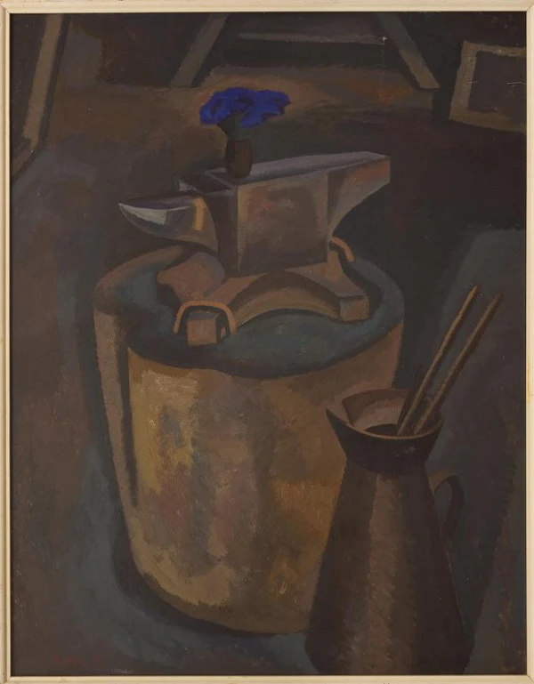 На переднем плане натюрморта изображён металлический кувшин, в который вставлены щипцы. Позади него расположена наковальня, на которой стоит небольшой кувшин с васильками. Все предметы размещены на широкой тумбе, а композиция выполнена в пространстве мастерской.