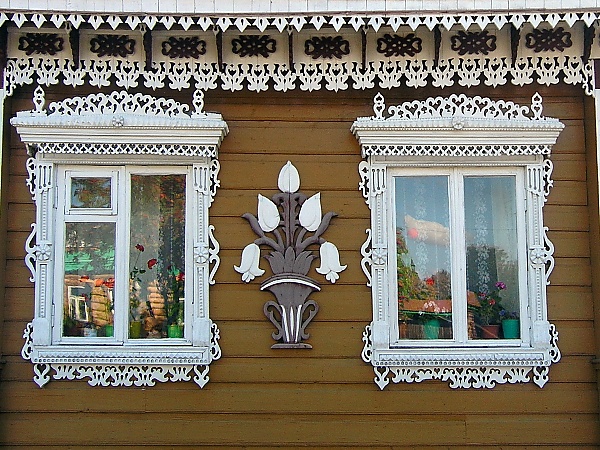 - Деревянный наличник выполняется из массива древесины методом профильного фрезерования накладных планок или же путём нанесения резных узоров.