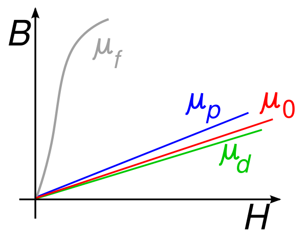 Связь между и напряженностью магнитного поля в диамагнитных и парамагнитных материалах обычно линейна (по крайней мере, при не слишком больших величинах намагничивающего поля):