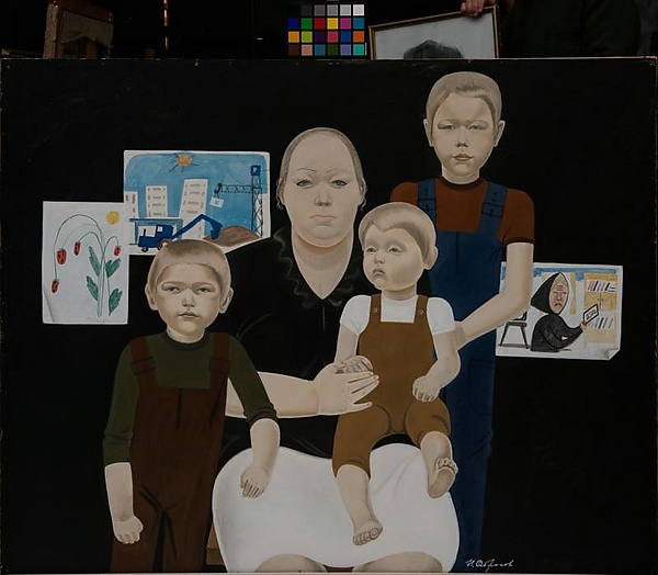 На картине представлен групповой портрет, выполненный на фоне черной стены, украшенной тремя рисунками. В центре композиции изображена светловолосая женщина в черном джемпере и белой юбке, сидящая анфас с ребёнком на коленях. Ребёнок одет в белую футболку и коричневый комбинезон. Слева от них стоит мальчик в тёмной одежде, опираясь на колено матери. Справа изображён подросток в бордовой футболке и синем комбинезоне. Чёрная стена и размещённые на ней рисунки служат фоном, подчёркивая центральные фигуры и особенности композиции.