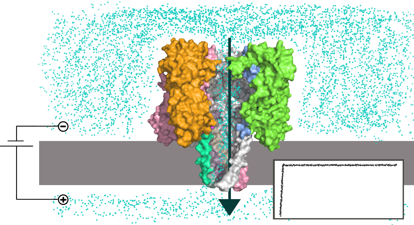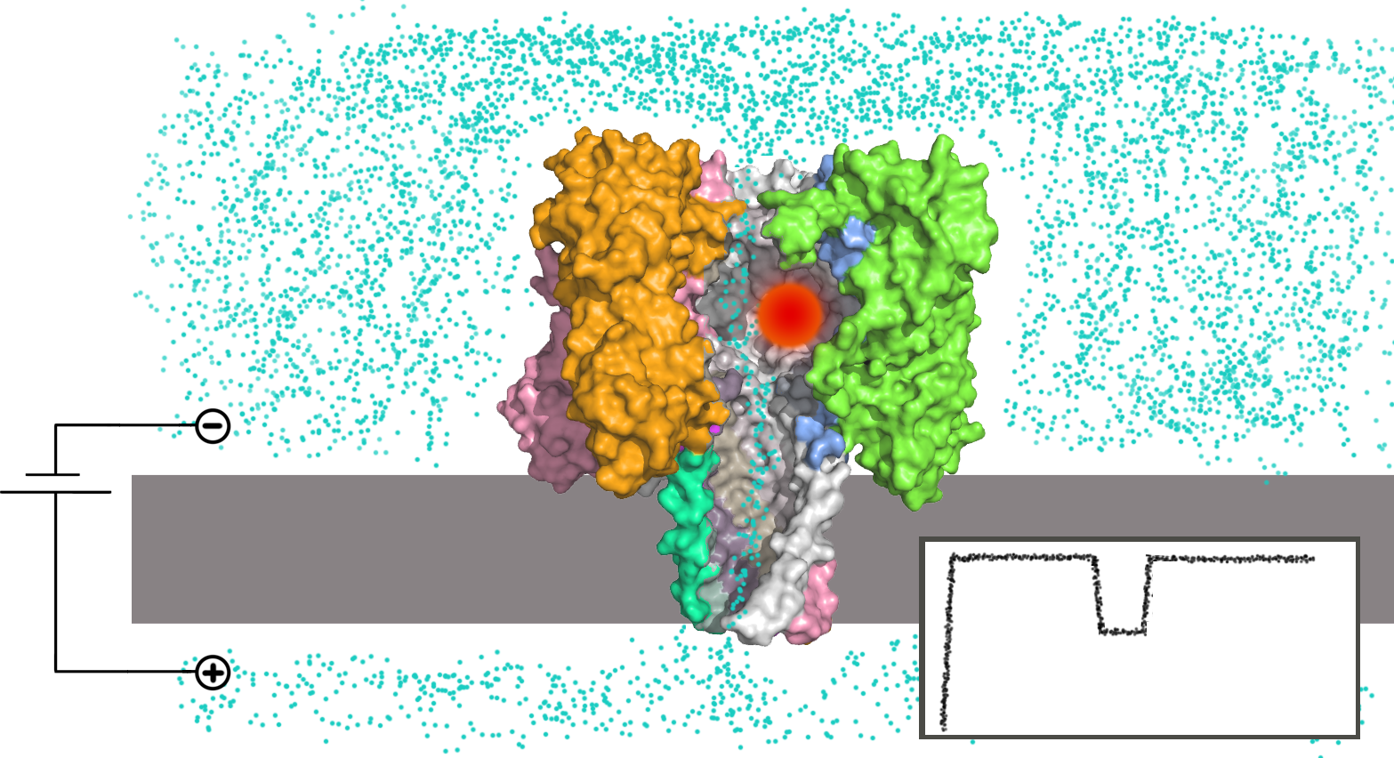 - Транспорт под действием напряжения. Так как ДНК и РНК несут на себе отрицательный заряд, то самым простым способом транспорта молекулы нуклеиновой кислоты через пору является их электрофоретический перенос вместе с ионами. Проблемой данного метода является то, что для измерения падения тока ионов через пору изначально требуется большой ток, чтобы получить хорошее соотношение сигнал/шум. Но при увеличении приложенного напряжения увеличивается и скорость, с которой молекула нуклеиновой кислоты преодолевает пору, а значит уменьшается время распознавания каждого отдельного основания, из-за чего качество распознавания падает[21].