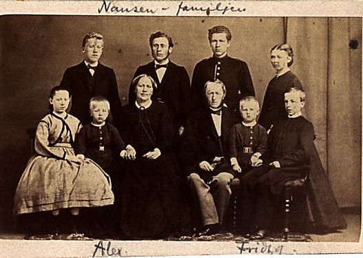 Бальдур Нансен был чрезвычайно строгим и религиозным человеком; будучи юристом, он пользовался у своих клиентов неограниченным доверием. Первым браком женат на Минне Мо — свояченице поэта Йоргена Мо. Минна скончалась в декабре 1854 года через неделю после рождения болезненного сына Ханса, умершего в возрасте 12 лет — в августе 1867 года[11]. Второй женой Бальдура Нансена стала баронесса Аделаида Йоханна Текла Исидореа Ведель-Ярлсберг (1832—1877), из рода немецкого происхождения, ведущего начало от князей Нассау-Зиген. Её дядя — граф Йохан Каспар Герман Ведель-Ярлсберг (1779—1840) — занимал должность вице-короля Норвегии и был автором норвежской конституции 1814 года[12]. В первый раз Аделаида вышла замуж за сына пекаря — лейтенанта Якоба Бёллинга, от которого имела пятерых детей[13]. Овдовев в 1853 году, Аделаида в 1858 году вышла замуж, предварительно посоветовавшись со старшими детьми, за Бальдура Нансена, который был её поверенным в делах[14][15]. После свадьбы чета Нансенов переехала в усадьбу Стурё-Фрён (ныне — Нансен-Фрён в городской черте Осло)[16]. Во втором браке было шестеро детей: первенец Фритьоф, родившийся в 1859 году, умер в годовалом возрасте. Второму сыну, родившемуся 10 октября 1861 года, было дано то же имя. В 1862 году у него появился брат Александр[14].