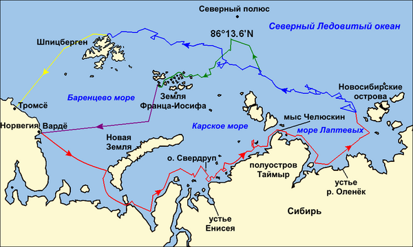 Нансен заявил, что предполагает существование морского трансполярного течения, проходящего от района Берингова пролива через околополюсное пространство в Гренландию. Согласно его расчётам, ледовые массы перемещаются от Новосибирских островов до Гренландии за 700 суток[95]. Это означало, что возможно практическое использование течения.