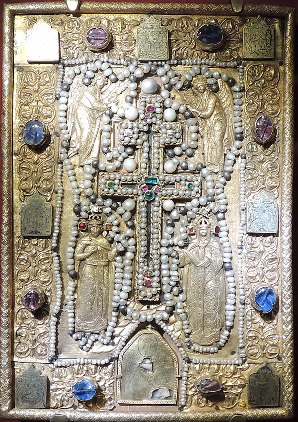 Реликварий обильно украшен жемчужинами и драгоценными камнями.